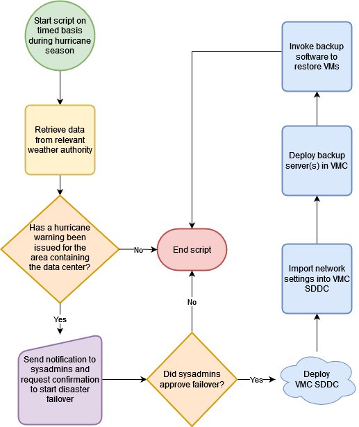 My idea is to combine the power of AWS Lambda with specially-crafted Python scripts to check the RSS feeds of weather agencies to determine if a hurricane warning has been issued for the geographic area containing your on-premises data center. If a warning has been issued, send a notification to the appropriate group of system administrators or I.T. personnel at your organization and ask for their confirmation to perform a failover. If they approve the failover, execute a series of AWS Lambda scripts to create a new VMC Software Defined Data Center (SDDC) in AWS, import your network and firewall settings, deploy appropriate backup servers in VMC, and invoke the backup software to restore your virtual machines.